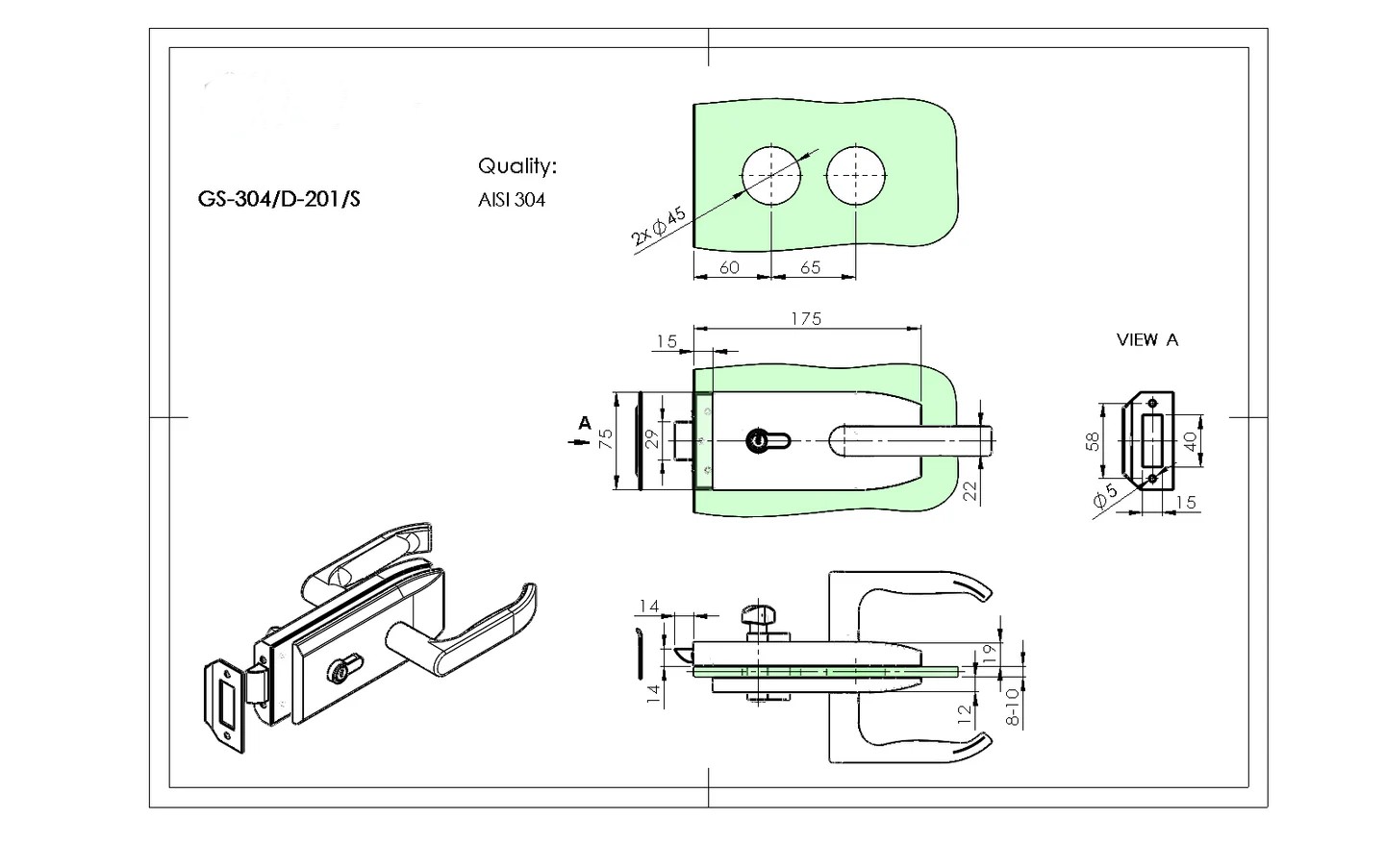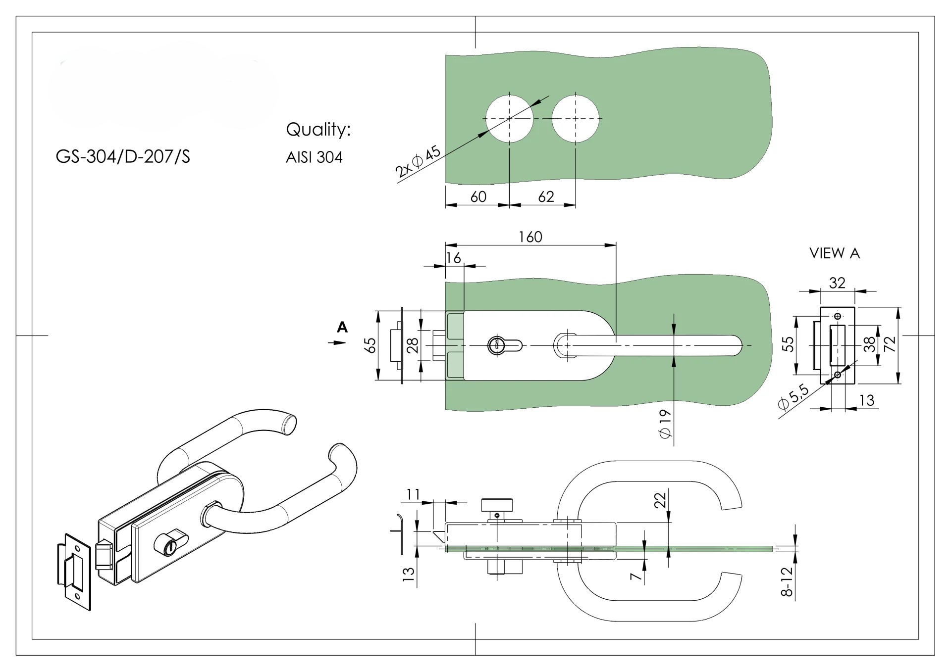 Material: Stainless steel AISI 304, Surface finish: Satined, Glass t: 8-12, Glass hole: Yes
